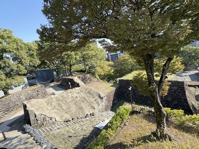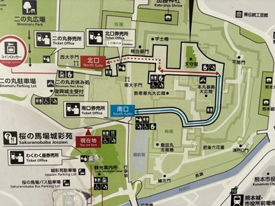 熊本城は現在特別公開ルートができており、それに従って見る形に。南口(旧櫨方門入口跡)からの青線部分は木橋が架けられ上から見下ろす形。逆にそれ以外の場所には入れない様子。