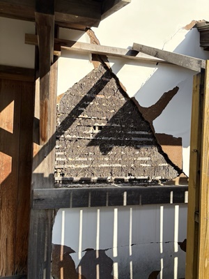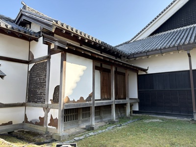 数寄屋丸御広間。真ん中辺りの石垣が崩れており、その上の建物もひしゃげている。ここの復旧工事は2042年予定。今ある建物もいったん解体するだろうしなあ。