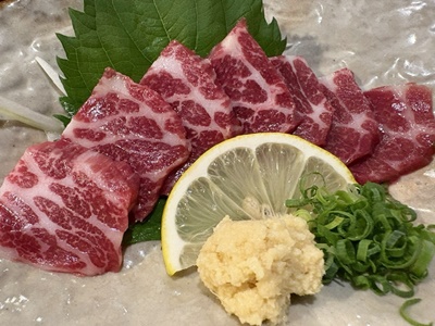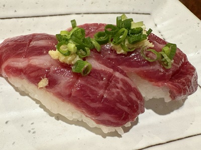 締めは高菜ご飯にしようかと思ったが、量が読めなかったので2カンの馬刺し握りにした。正解かな。