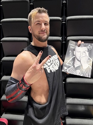 電車通りに出ると凄い雨。早めに熊本城ホールというかサクラマチクマモトに。トイレ行って12時開場を待つ間東京女子後楽園大会の第1試合だけ見る。開場したらグッズ列に並びKONOSUKE TAKESHITAの撮影券GETのためタオル2枚買う。さらに石田とクリスのポートレートも。クリス。「今日帰る?飛行機?空港で会うかもね。」なんかほっこりする。