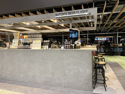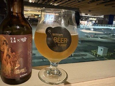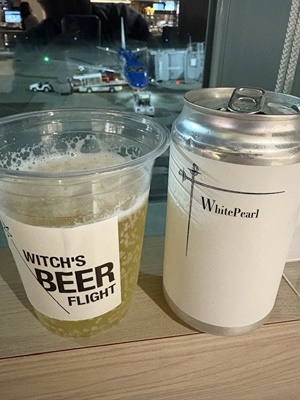 飛行機の発着見ながらビールが飲める。1杯目はひでじビール(延岡)の生頼範義コラボのベルギー風ビール。