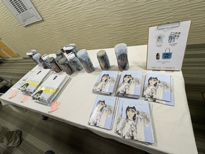 最初に横山実郁グッズだけ買って会計済ませたが、どうもそういう流れではなく、両方買って会計2回のようだ。なので並び直してササダンゴグッズ買ってサイン会に。最後尾札には「2ショット」とあるが、