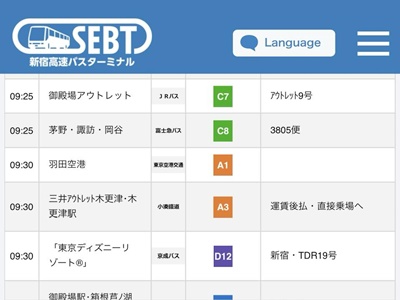 バスタにあるQRを読み込むと出発予定のバス一覧が出る。乗り場だけでなく支払方法も表示してあるのは便利。乗り場の係員が嘘言って騙されかけたけど。