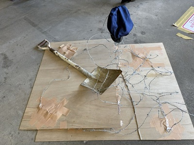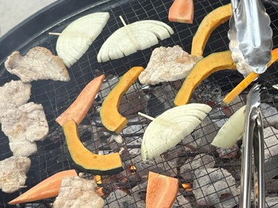 15時35分からバーベキュー。入り口にモニュメント。みのる「粗大ごみだな。」