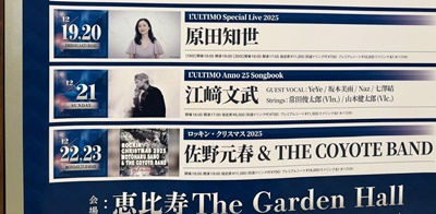 案の定尿意を催したので休憩あって助かった。サッポロビールが後援だからその辺考慮してんのかな。3曲目の曲紹介で知世様、「次の曲は『うた』.........なんで切っちゃったんだろう?絶対切ったらいけないのに。次の曲は『うたかたの恋』です。」しかも「2004年の曲」と言ってて、「え、もうあの名曲から20年になるの!?」と思ったが、普通に2014年の間違い。知世ちゃん・・・。アンコールが終わってまだ拍手が鳴りやまないので1人出てきて「あ、『ありがとう』を言いに来ただけです。よいお年をー。あ、メリークリスマス!」何年たっても知世ちゃんは知世ちゃん。chorusのSARAさんはXに「姪」と書いてた人いたから貴和子さんの娘さんかな。伊藤ゴローさんの長男の太郎さんもkeyboard&percussionで入ってたし。ちなみにゴローさんは翌21日からはchelloのロビン・デュプイさんと唐津はじめ九州でツアーらしい。あとviolinの伊藤彩さんが途中立ち上がってguitar弾き出したのはカッコよかった。