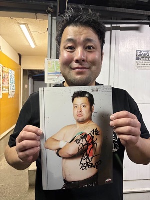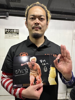 マリカのギャルレスリングがサインもらいに行って褒めたたえる。