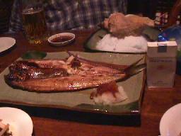 ほっけ(左写真)。右のタバコは大きさの比較のため(ベタ)。奥にあるのが「つぶやき」。デカいつぶ貝を壷焼きにしたもの。23時終了。札幌ラーメンには興味がないので食べず。暑いし。