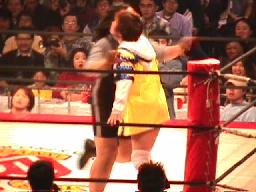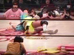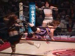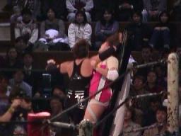 場外戦。えらい端まで連れて行くと思ったら2階席の真下に京子を寝せ、豊田が2階席からダイブ(左写真)。凄すぎ。