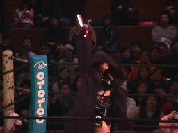 矢樹コーナーに上ってミサイルキック(右写真)。
