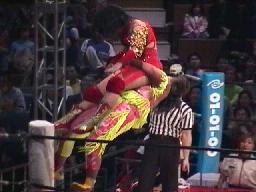体当たり2発からのダイビングプレス(左写真)でデビュー戦フォール勝ち。コーナー上るのにえらい時間かかったけど。