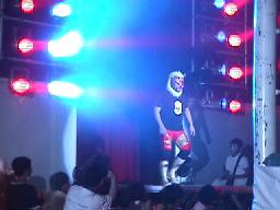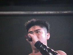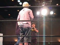 試合開始30分前から、下関のローカルFM(not TARO)「Come on! FM」の番組「フィニッシュホールド」(MC:ゴンザレス弘中氏、アステカはレギュラーらしい)の公開録音が。弘中氏は足を骨折したとかで松葉杖姿。今日タッグ、明日シングルでディアブロと当たる川内が激しく口撃する(左写真)。アステカからは「第1試合負けたら川内はメインには出さない」と宣告(1日2試合の予定だった)。