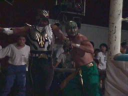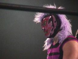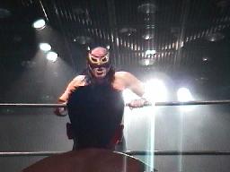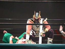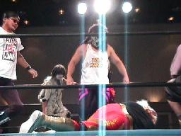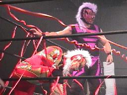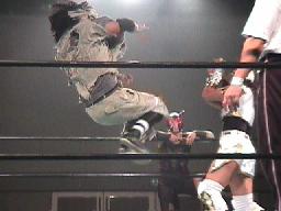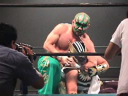 アステカが入るがアステカにもブレーンクロー。アステカは場外に放り出される(右写真)。死神フェースバスター、地獄突き。川内飛びつき十字固め、形は崩れたが強引に持って行く。アステカにタッチ。アステカヘッドロック、死神ロープに振ってタックル。アステカタックル返す。15分経過。