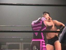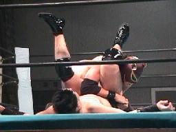 川内ストンピングからギロチンドロップ、カウント2。バックの取り合いからパンサー急所蹴り、すかさずスクールボーイ(右写真)。うはは、セコい。でも2カウント。パンサーさらにコーナーに押し付けてのスクールボーイ、これも2。