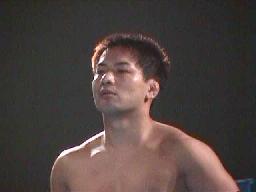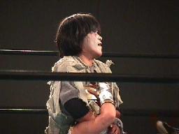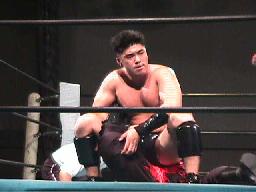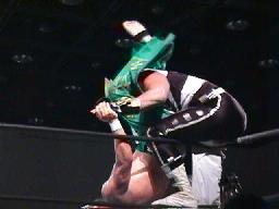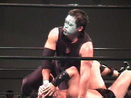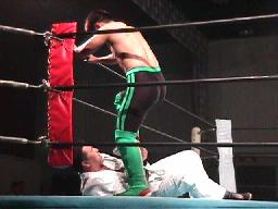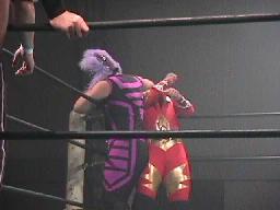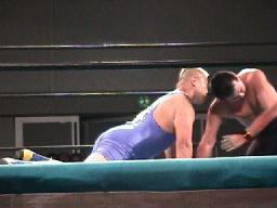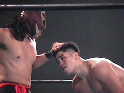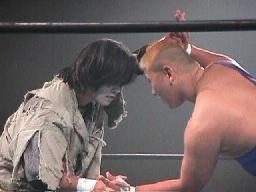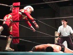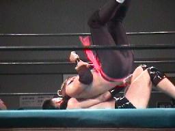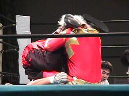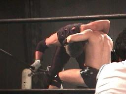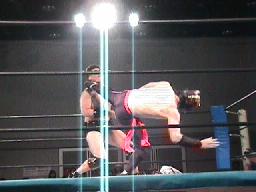 川内最初は勢いよく攻めて行くが急所攻撃(子供マジ怒り)で形勢逆転され、さらにチンクラッシャー(右写真)で動き止まる。ディアブロは死神にタッチ。川内ドロップキック、タックル行くが死神倒れない。2発目のタックルで倒すとブレーンバスター行くが失敗。逆にワンハンドのボディスラムを食う。