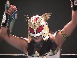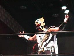 今回からリングネームも正式に「神仮面ファラオン」に。なりきってます。アステカによると「もともとボクがモチーフだったのに、年の功で取られました」だそうだが。