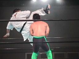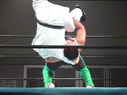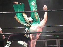 もう一発スワンダイブでサマーソルトドロップ(右写真)。5分経過。