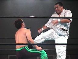 立ち上がろうとする福田に下段蹴り4連発(左写真)。上着を脱ぐとミドルからハイのコンビネーションで福田を倒しカバー、3カウント。