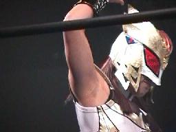 川内必死にコーナーに戻る。アステカもコーナーから手を伸ばす(右写真)。ようやくタッチ。なんとなくアステカがデルフィンに見えたが、まあいいか。