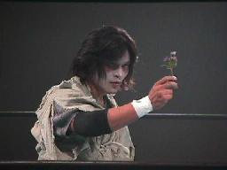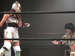 そこにゲレーロ・ディアブロ、NMCの面々が殴り込んでインタビューをぶち壊しに(右写真)。弘中氏は松葉杖を奪われ、リングに座り込む。コスモ☆ソルジャー、藤崎らが救出に。しかしここで事件が。藤崎が逃げるNMCにくだんの松葉杖を投げつけたのだが、それが客の女性の顔面を直撃、その人は病院へ(後から戻って来たくらいで、重傷というわけではないが、女性の顔に傷ですからねえ)。藤崎ロストポイントだ。
