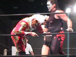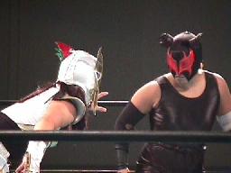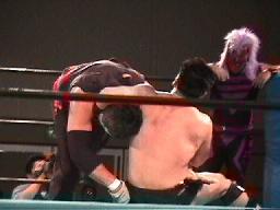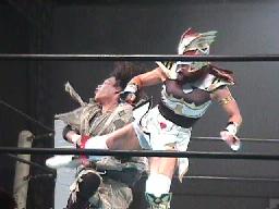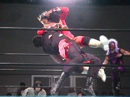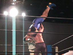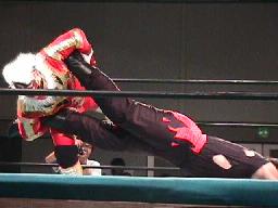 アステカ死神にキック、チョップ、串刺しラリアット。逆エビに取るが、これは死神がコークスクリューでハネ返す(左写真)。アステカもう川内にタッチ。ダブルで振ってチョップ。