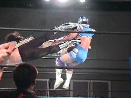 パンサーコーナーに下がり足踏み開始。おお!マイケルズ式だ。ということはトラースキックではなくスイート・チン・ミュージックだな、これ(右写真)。カウントは2。しかし川内は2発目をかわすとラリアットからコブラクラッチに取り、そのままキャメルクラッチとの複合技に。パンサーギブアップ。