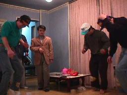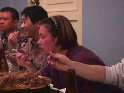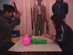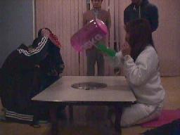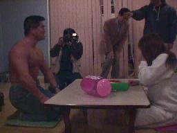 食事・歓談が落ち着いたところでゲームのお時間。まずは選手とピコピコハンマー大会。ジャンケンで勝った方がハンマーを取って殴り、負けた方が金属製のお盆を取って防御する、という奴。最初はあまり乗り気じゃなかった日向(左写真)だったが、ハンマーの取り合い、そして殴り合いに入るといきなり目つき変わる。スピードも昼間の動きの倍以上。しまいにゃジャンケンで負けても真剣にくやしがる。このモードがリング上では出てるわけですね。で、ほとんど勝ってたような。
