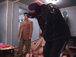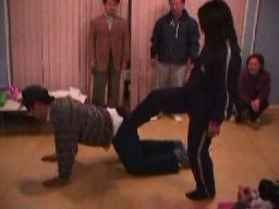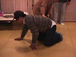 続いては人気企画「目隠しでポン」。目隠しして選手(たまに参加者)の技を受け、何番目に自分の指定した選手がやったかを当てるゲーム。これには「無料」技と「有料」技があり、「有料」は金を払って技を受けるというもの。ちなみに無料は逆エビ固め、張り手(右写真)、ストンピング。有料は急所蹴り、ヒッププレス、フルネルソンなど。無料と有料の基準は密着度か変態度か。