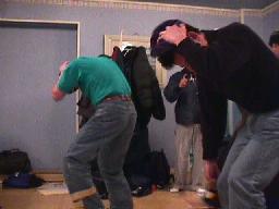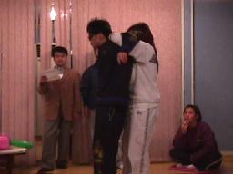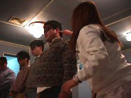 ここからはまた「3軍対抗」。福岡チームのメンバーが多すぎるのでチーム間で調整あり。まずは万歩計ゲーム。頭、腰、足に万歩計を付けて、一定時間のカウントを競うという奴ですな。この時点までは後ろにカーテンがあったんですが・・・・