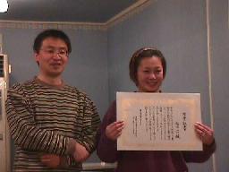 福岡選手に「卒業証書」授与。授与者はジャンケンでタイガーに勝ったP-CANひかり氏。