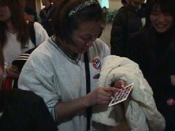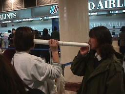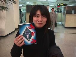 出国審査(月曜日なので時間かからず)を済ますと何もすることなし。退屈なので日向選手に「あずみ」のコミックス(参加者が持って来てた)を持たせて写真を撮ってみる。空港免税店に大したものもなく(3月12日にもうひとつ免税店ができるらしいが)、なんの時間潰しもできぬまま16時50分に搭乗。17時半離陸、2時間弱のフライトのはずが、また成田が混んでおり、ゴーラウンドの末に20時に着陸。ちなみに自分の帰りの座席は知らない人間に囲まれていたためツアー気分なし。機内食はまた貧弱。