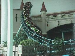 恐竜が顔を出す「ベスビオス」の下でポーズ(榎本さん企画)。そうこうするうちに開演。ネタはボディボードみたいな奴に乗って坂を下る、というもの。実写でもあり、さほどの恐怖感はなかったが、MORIMORIは「だまされたー!」と叫び続け、ヤマモは固まっていた。