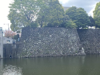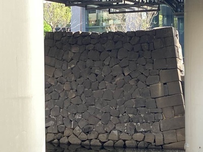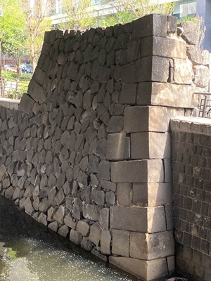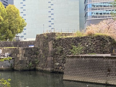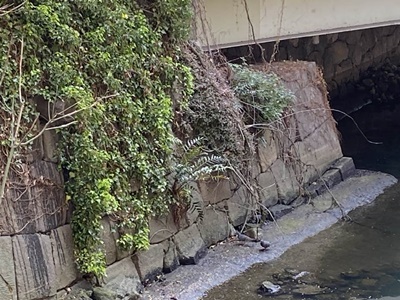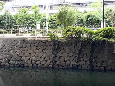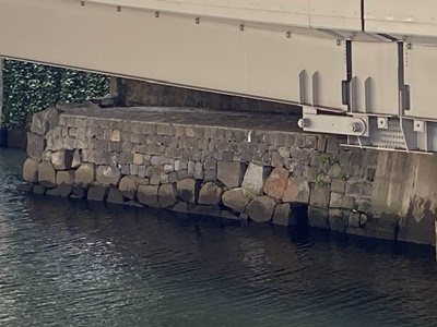 隣の鎌倉橋の下にも石垣。しかし鎌倉橋は関東大震災後に架けられたもので、これは門跡ではなく外堀の石垣。