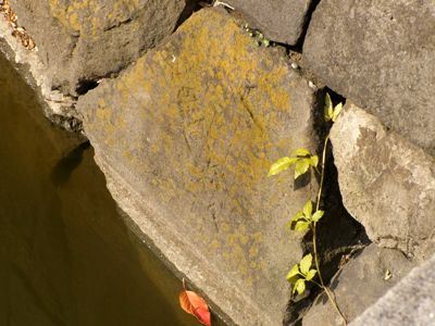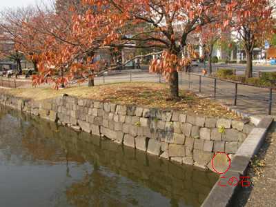 この石垣の水際。内堀通りの和気清麻呂像の建ってる小さい公園の隅の石垣の水際。