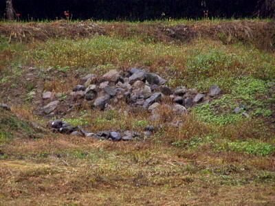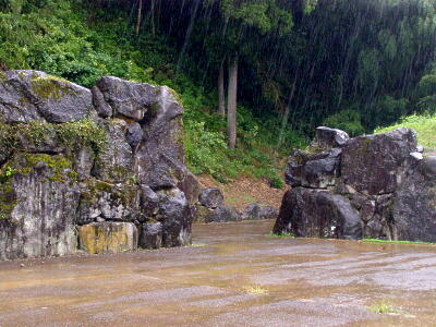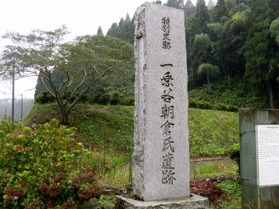 「一乗谷朝倉氏遺跡」の石碑。ここから遊歩道を歩いて行くとJR一乗谷駅、朝倉資料館(駅から近い)に着く。義景館跡からは約1.3km。なので福井からは京福バスで「武家屋敷跡」まで行って来た道を戻る形で朝倉資料館まで歩き、帰りは「資料館前」からバスに乗るか一乗谷駅からJR九頭竜線に乗るのが良さそうだ。