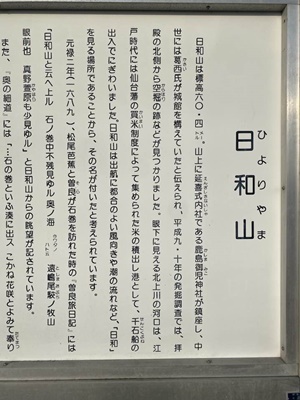 ちょっとした高台の住宅街を登り切ると日和山公園。石巻城跡の説明板。