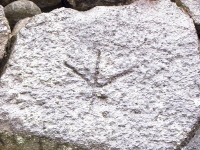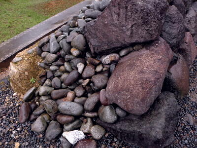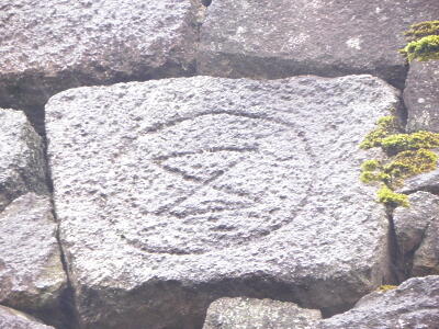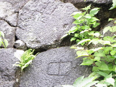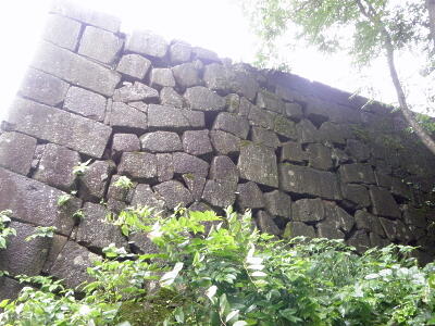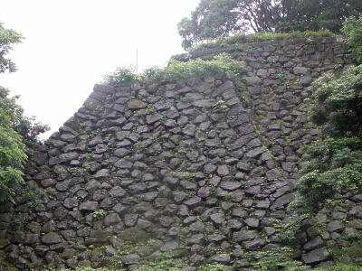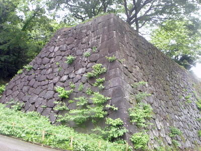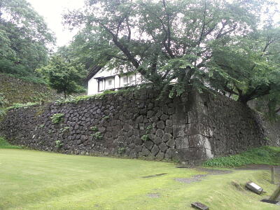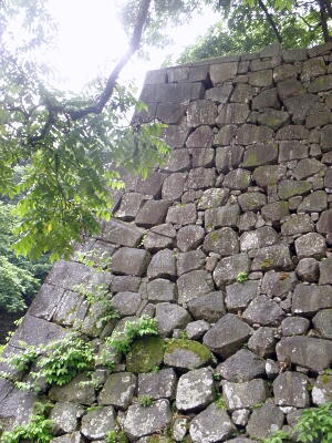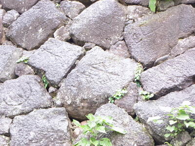 東ノ丸北面石垣。「文禄元年(1592年)、利家は、急ごしらえの平山城であった金沢城の石垣改修にのりだします。この石垣は、場内で最も古い技法が用いられており、金沢城の初期の姿を伝える数少ない貴重なものです。自然石や粗割りしただけの石を緩い勾配で積み上げた『野面積み』になっています。」
