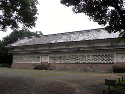 鶴丸倉庫(金沢城土蔵)。「嘉永元年(一八四八)に建て替えられた武具土蔵で、石川門、三十間長屋とともに場内に残る藩政期の数少ない建物の一つ。全国の城郭内土蔵の中でも最大であり、腰の石貼りや窓回りなど意匠的にも優れた遺構として、平成二十年(二〇〇八)に国の重要文化財に指定された。明治以降、軍隊の被服倉庫などとして利用・修理されているが、基本構造は創建時のままである。」前回来た時はまだ重文じゃなかったようだ。