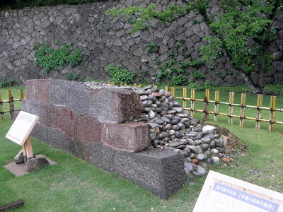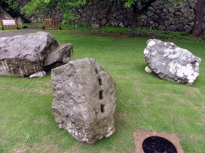 いもり堀園地には復元時に使われなかった石の展示が。矢穴の開いた石の展示。