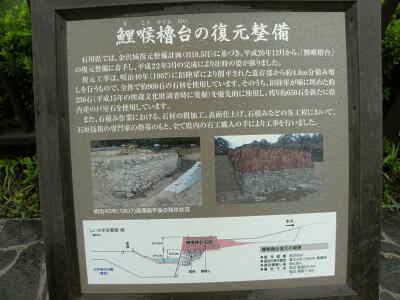 鯉喉櫓台の復元説明板。「石川県では、金沢城復元整備計画(H18.5月)に基づき、平成20年12月から『鯉喉櫓台』の復元整備に着手し、平成22年3月の完成により往時の姿が蘇りました。復元工事は、明治40年(1907年)に旧陸軍により削平された現存部から約4.2m分積み増しを行うもので、全体で約900石の石材を使用しています。そのうち、旧陸軍が堀に埋めた約250石(平成15年の埋蔵文化財調査時に発掘)を優先的に使用し、残り約650石を新たに県内産の戸室石を使用しています。また、石積み作業における、石材の粗加工、表面仕上げ、石積みなどの各工程において、石垣技術の専門家の指導のもと、すべて県内の石工職人の手により工事を行いました。」