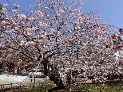 近くの光善寺境内にある血脈桜。昔、伐採を決めたその夜に一人の娘が現れ「浄土に渡る血脈を」と住職に懇願し、住職が与えたところ翌朝それが桜の枝に下がっていたため、「さては桜の精であったか」と伐採を取りやめたという伝説の木。樹齢280年と言われる。