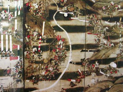 有名な長篠合戦絵図(もちろん写し)。織田・徳川連合軍が三千挺の銃を千挺ずつ三隊に分けて交代で武田軍を一斉射撃、騎馬部隊を壊滅させたというのは伝説に過ぎないらしい。銃の数は織田・徳川が1500、武田側が500だったそうで。