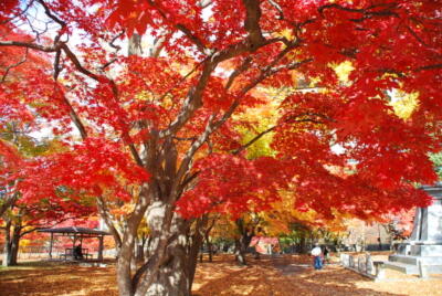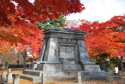 南部利祥(南部家42代当主、最後の藩主・利恭の長男で日露戦争中に23歳で戦死)銅像の台座と紅葉。像自体は太平洋戦争中に供出された。像作りなおすか台座撤去するかどっちかしないのだろうか?