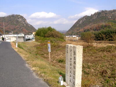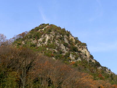 沼田川沿いの新高山小早川城址道から。左が新高山城、右が高山城。
