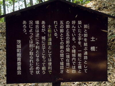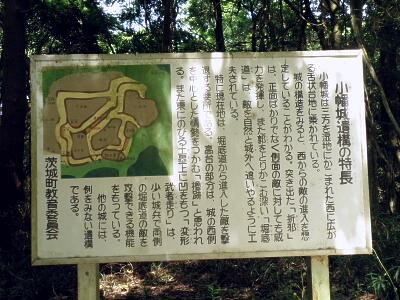 説明板。「小幡城は三方を湿地にかこまれた西に広がる舌状台地に築かれている。城の構造を見ると、西からの敵の進入を想定していることがわかる。突き出た『折邪』(おりひずみ)は、正面ばかりでなく側面の敵に対しても威力を発揮し、また郭をとりかこむ深い『堀底道』は、敵を自然と城外へ追いやるように工夫されている。特に現在地は、堀底道から進入した敵を撃退する要所である。高台の部分は、城の西側を中心とした情勢をつかむ『櫓跡』と思われる。また東にのびる土塁上に凹をもつ『変形武者走り』は、少い城兵で両側の堀底道の敵を攻撃できる機能をもっている。他の城には、例をみない遺構である。」