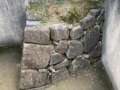 以前はテニスコートがあった本丸下の段は発掘され、建物跡にはそれを示す石垣が。