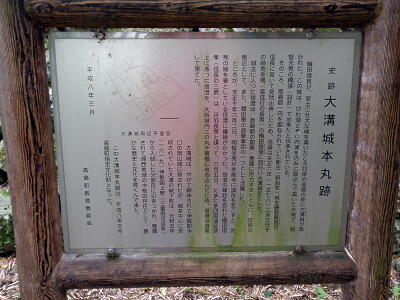 説明板。「織田信長が安土に壮大な城を築いた頃、対岸の高島の地に大溝城が築かれた。この城は、琵琶湖とその内湖を巧みに取込んで築いた城で、明智光秀の縄張(設計)で出来たと伝承されている。その頃、高島郡一円を委ねられていた新庄(新旭町)城主磯野員昌が、信長に背いて突然出奔したため、信長は天正六年(一五七八)二月三日、その跡地を甥の織田信澄に宛行い、大溝城主とした。城主に入った信澄は、高島郡の開発・発展に尽力するとともに、信長の側近として、また織田軍の遊撃軍団の一つとして活躍した。ところが、天正十年(一五八二)六月二日、明智光秀が本能寺に謀反を起こすと、光秀の娘を妻としている信澄に嫌疑がかかった。信澄の蜂起を恐れた織田信孝(信長の三男)は、丹羽長秀と謀って、六月五日、たまたま四国遠征途上にあった信澄を大阪城内二の丸千貫櫓に攻め込んだため、信澄は自害して果てた。大溝城は、やがて解体されて甲賀郡水口の岡山城に移築されたが、城を中心に形成されていた大溝の城下町は、元和五年(一六一九)、伊勢国上野(三重県河芸町)から入部した分部氏に引継がれ、整備されて湖西地域の中核的存在として、豊かな歴史と文化を育んで来た。この大溝城は平成八年三月、高島町指定文化財となった。」