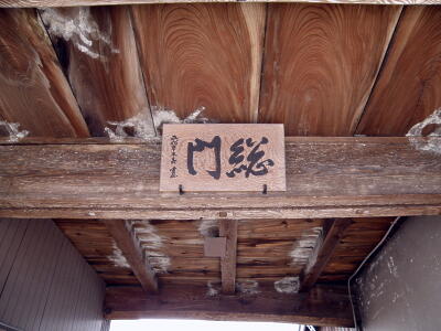 説明板。「元和五年(一六一九)八月、高島郡を中心に二万石の領主として、伊勢国上野(三重県河芸町)から江州大溝(高島町)に入封した分部光信(一五九一〜一六四三)は、さきに織田信澄(信長の甥・明智光秀の女婿)が築いた大溝城(水城)の西に、陣屋・武家屋敷を構築し、背戸川を境として石垣・土塁を巡らせてこの地に総門を設けた。宝暦五年(一七五五)秋、大修理して今にいたる。棟瓦には分部氏の定紋(丸の内に三引)が残り、両袖に部屋のあるこの長屋門は大溝城関係建造物でただ一つ現存する貴重な遺構である。」
