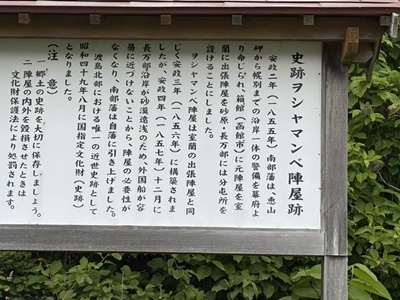 1856年に築造されたものの、長万部沿岸が遠浅で外国船が近づけないため陣屋の必要性が無くなりン南部藩は引き上げた、と。つまり1年も存在していなかった陣屋(分屯所)。