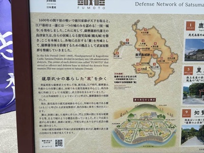 麓の説明。「江戸時代、薩摩藩は、外敵からの攻撃に備え、本城である鹿児島城を中心とし、県内各地に外城(とじょう)を配置し、武士団を住まわせていました。これは外城制度(とじょうせいど)と呼ばれ、薩摩藩独自の体制でした。現在、鹿児島市の鹿児島城跡を中心に、外城の中心地である麓(ふもと)と呼ばれる武家屋敷群が、県内各地に数多く残されています。麓は、防御に適した場所に作られ、門と玄関の間に生垣を配置する等、まるで城のような構造を持っていました。そこでは武士等が心身を鍛え、農耕に従事し、平和な世でありながら武芸の鍛錬に励みました。本城の鹿児島城跡や外城の武家屋敷群を歩けば、薩摩の武士達の往時の生き様が見えてきます。」