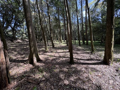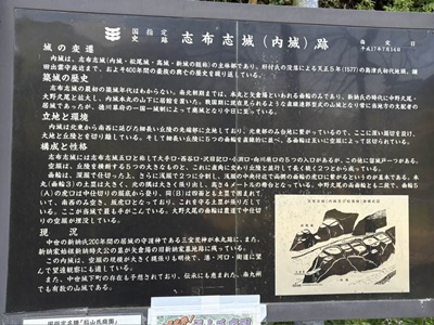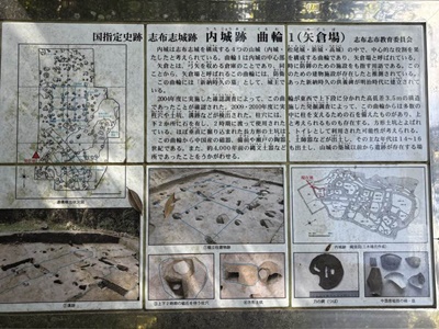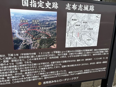 志布志城の説明板。「志布志は、万寿3年(平安時代中期 1026年)に平季基によって開かれた日向国の大荘園島津荘(現在の宮崎県都城市)として発達した。志布志湾に面した前川の河口付近に、河川で浸食・分断された標高50m程のシラス台地の東端に内城・松尾城・高城・新城があり、この4城をあわせて「志布志城」と呼ぶ。いずれも石垣や天守閣はなく、地形を利用した戦いのための砦のような「山城」である。志布志城の築城者と築城年代は正確には不明だが、文献で初めて記載があるのは、建武3年(室町時代 1336年)で、「志布志城の肝付氏が重久氏に攻められた」という記録が残っている。志布志城の領主は、港の所有をめぐって幾度も交代しており、記録に残る領主を大きく分けると、肝付氏−楡井氏ー新納氏ー豊州家島津氏ー肝付氏−島津氏の流れとなる。その後、徳川幕府の一国一城令によって廃城となり現在に至っている。志布志城の中心である内城の規模は、山城部分だけでも南北500m、東西250mになる。志布志にこのような広大な山城が作られたのは、この地が海上交通の要所であり、国内のみならずアジアの各地とつながった国際的な貿易港であったからと考えられる。」